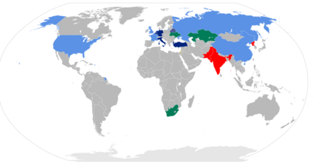 Признанные ядерные державы, ратифицировавшие договор Другие страны, ратифицировавшие договор Вышедшая из договора страна (КНДР) Частично признанное государство, соблюдающее договор (Китайская Республика) Признанные ядерные державы, присоединившиеся к договору Другие страны, присоединившиеся к договору, или преемники Не подписавшие договор страны (Индия, Израиль, Пакистан, Южный Судан)