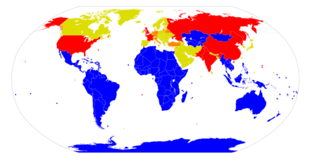 Государства, обладающие ядерным оружием Государства, предоставляющие свою территорию для размещения ядерного оружия ядерных держав Государства, состоящие в альянсах с государствами, обладающими ядерным оружием (кроме Украины) Государства — члены соглашения о безъядерных зонах. Государства, которые подписали, но не ратифицировали соглашение о безъядерных зонах, которое остаётся не вступившим в силу в этих государствах