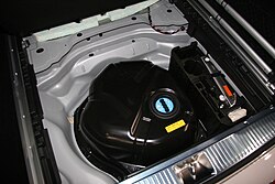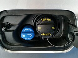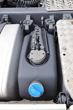 В автомобиле для AdBlue предусмотрен отдельный бак и своя заправочная горловина (обычно синего цвета, рядом с лючком бензобака или в багажнике. Из этого бака электроника сама дозирует жидкость и через специальную форсунку впрыскивает её в горячий выпускной тракт перед катализатором SCR. Там мочевина разлагается, превращается в аммиак и нейтрализует вредные оксиды азота[5].