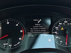 При аварийном режиме двигатель сначала ограничит мощность, а после определённого пробега перестанет заводиться. Бортовой компьютер заранее начинает напоминать о наполнении бака для AdBlue. Игнорировать эти сообщения не получится — машина просто «заблокирует» себя, пока бак снова не будет заполнен качественным AdBlue[5].