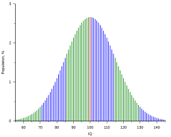 Впоследствии коэффициент интеллектуальности получил иную формулировку, в которой исходным считается представление о нормальном распределении интеллекта в популяции. Средним показателем коэффициента ума считается уровень в 100 единиц, где в диапазоне между 90 и 110 единицами находятся результаты половины тех, на кого рассчитан тест. В диапазоне между 85 и 115 единицами (в пределах одного стандартного отклонения) располагается около 23 результатов, где показатели ниже 85 единиц указывают на сниженный (низкий) интеллект, а показатели выше 115 единиц — на относительно высокое развитие интеллекта. Ниже показателя в 70 единиц (за пределами двух стандартных отклонений) лежит умственная отсталость, а выше 130 (иногда 120[7]) — одарённость[8][9][10][11].