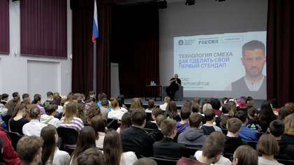 Стас Старовойтов – российский актер, стендап-комик, музыкант выступил в роли лектора акции «Достижения России» и рассказал молодым слушателям про свое развитие в сфере стендапа, а также поделился секретами личного успеха.