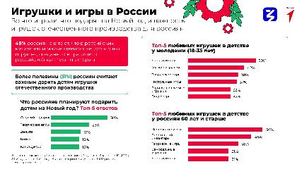 Не остался без внимания и вопрос о доступности игрушек отечественного производства. Практически каждый второй респондент считает, что в российских магазинах недостаточно игрушек, созданных в традициях российской культуры и истории (48%) (сказок, фольклора, народных персонажей), и примерно каждый третий (35%) говорит о том, что таких игрушек достаточно. Кроме того, половина опрошенных (51%) считают важным дарить детям на Новый год игрушки отечественного производства. Это говорит о потребности в поддержке местного производства и сохранении культурного наследия через индустрию игрушек.