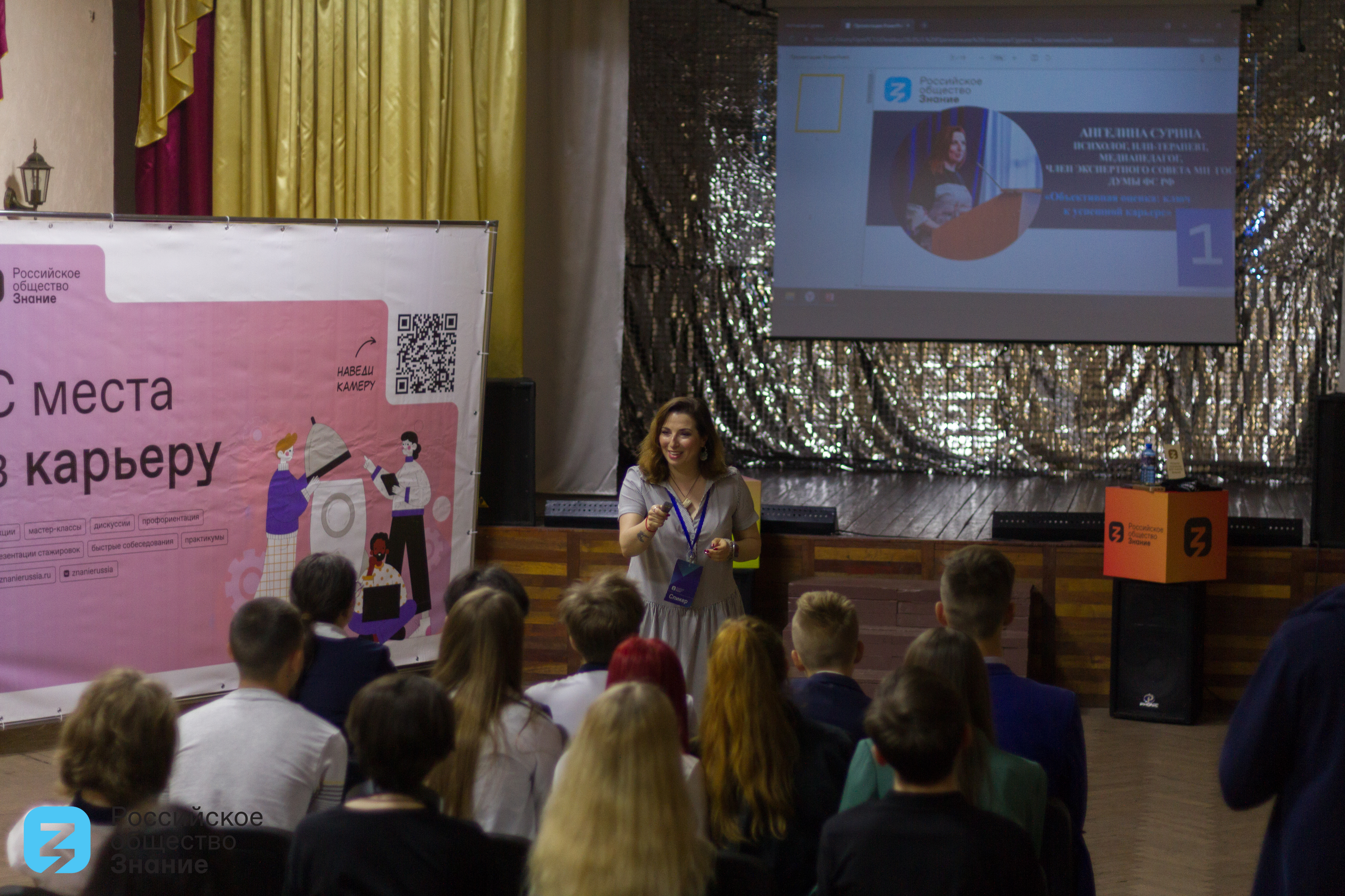 Также к аудитории обратилась директор филиала Российского общества «Знание» в Донецкой Народной Республике Людмила Сапрыкина. Она рассказала, что Общество «Знание» — главная просветительская организация Российской Федерации, и пригласила школьников заходить на официальный сайт и на страницы Общества «Знание» в социальных сетях, где всегда можно найти полезную и при этом достоверную информацию по самым разным вопросам.