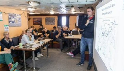 Лекцию в необычных – арктических – условиях провел руководитель экспедиции, директор Института стратегического развития Арктики САФУ, лектор Общества «Знание» Александр Сабуров. Речь шла об организации работы полярных исследователей разных лет.