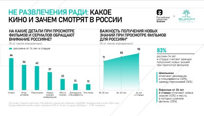 Совместное социологическое исследование Российского общества «Знание» и ВЦИОМ, приуроченное к Дню российского кино, показало, что 83% населения нашей страны смотрят кино с целью получения новых знаний. При этом значимость просветительской функции кинематографа растет по мере увеличения возраста респондентов.