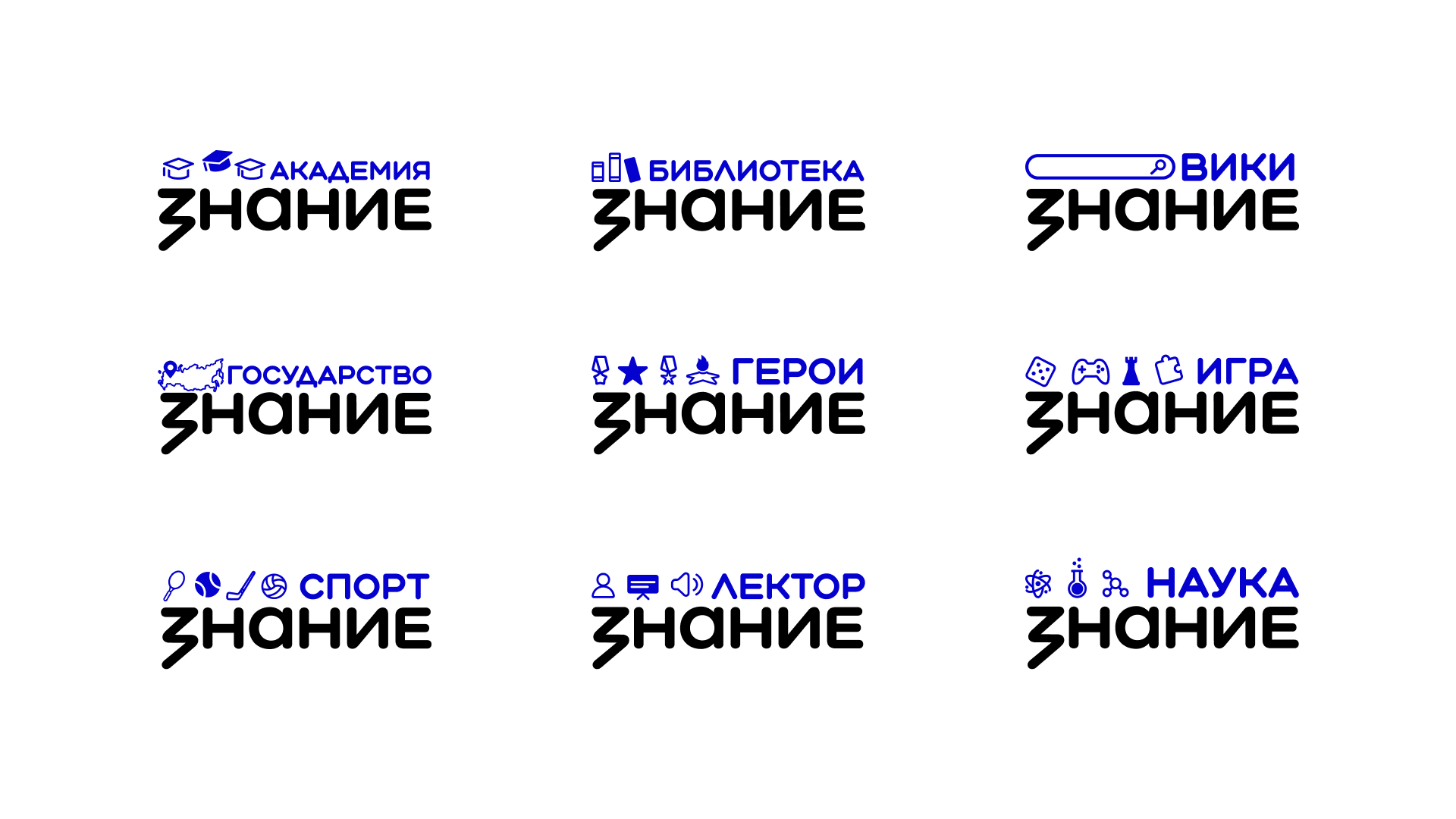 Отдельным направлением работы стало создание единой визуальной коммуникации для просветительских проектов Общества «Знание». Так появилась система, в рамках которой к основному знаку, выступающему в качестве визуального якоря, добавились названия проектов. Логотип стал более удобным для использования в различных форматах. Новое решение позволило сохранить идентичность материнского бренда, одновременно усиливая узнаваемость продуктов организации.