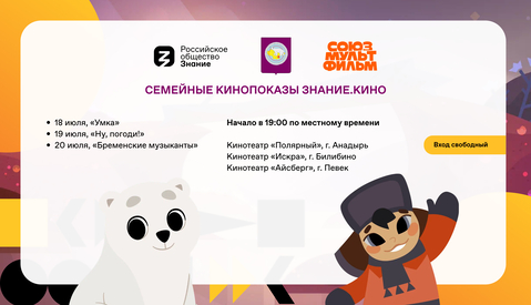 Регион проведения эксклюзивных семейных кинопоказов выбран неслучайно. В рамках флагманского трека Знание.Кино Российского общества «Знание» все колледжи Чукотского автономного округа присоединились к реализации наших тематических кинопоказов просветительского контента. Поэтому мы решили для местных жителей организовать семейные кинопоказы мультсериала «Умка», новые серии которого «Союзмультфильм» представил в конце прошлого года, а также показать любимые истории «Ну, погоди!» и «Бременские музыканты». Это, действительно, по-настоящему добрые семейные мультфильмы, на которых выросли целые поколения наших соотечественников,