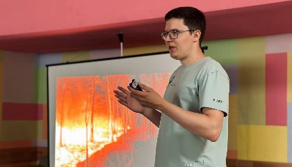 Второй блок лекции был посвящен совместному исследованию сотрудников кафедры физической и вычислительной механики Томского государственного университета и их коллег из Института оптики атмосферы СО РАН. Денис Касымов показал школьникам, как на основе математических расчетов ученых можно бороться с лесными пожарами.