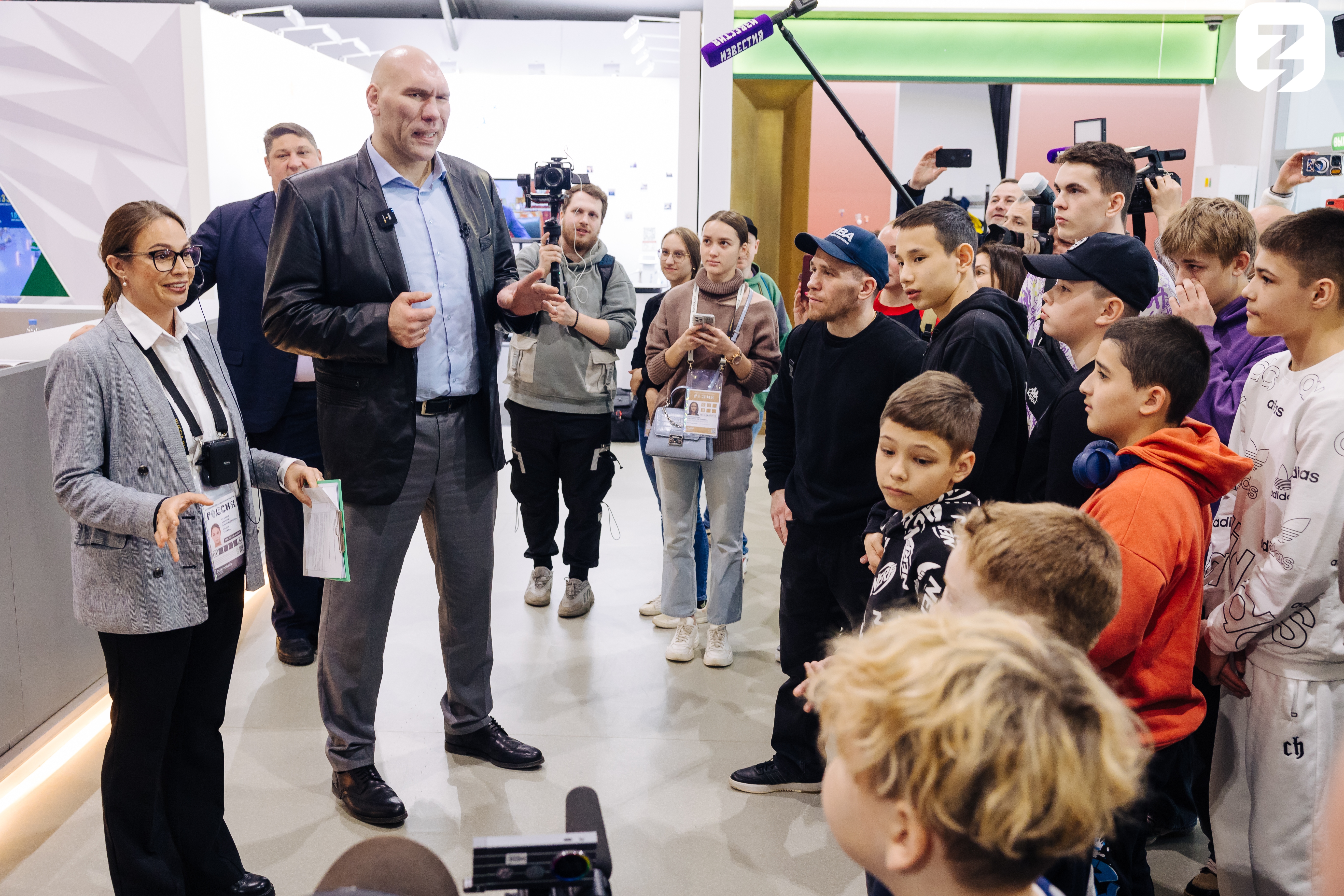 Юноши и девушки посетили стенды «Спорт для каждого — мир развлечений», «Игры будущего». Здесь Николай Валуев и ребята обсудили недавний одноименный чемпионат в Казани, фиджитал-спорт и его перспективы. Опытный спортсмен обратил внимание, что в дисциплинах фиджитал-спорта перед участниками стоит непростая, но от этого еще более интересная задача — проявить свое мастерство и в виртуальном, и реальном пространствах.