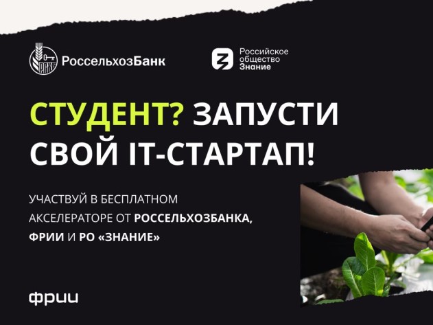 Россельхозбанк в партнерстве с ФРИИ и Российским обществом «Знание» начал прием заявок от студентов российских вузов на участие в студенческом агротех-акселераторе. Участие смогут принять студенты старших курсов бакалавриата, специалитета или магистратуры, а также аспиранты и молодые ученые, у которых есть инновационные решения для развития технологий и сервисов на платформах экосистемы «Своё» от РСХБ или идеи по запуску своего агротехнологического стартапа. В акселератор могут пройти также участники, которые обладают высокими компетенциями и мотивированы на работу в агросекторе.
