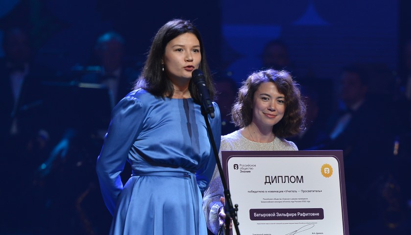 Руководитель проекта «Академия Знания» Российского общества «Знание» Александра Буйчик наградила победителя номинации «Учитель-просветитель года». Специальный приз лучшему лектору получила учитель английского языка Ямало-Ненецкого автономного округа Зильфира Рафитовна Батырова.