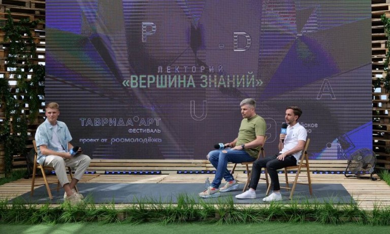 Очень символичный момент: наша студия оформлена с помощью транспортировочных паллет. Российское общество «Знание» – это тоже транспорт. Мы передаем знания от одних людей другим: от выдающихся экспертов – всем тем, кто хочется развиваться и узнавать новое. Эта студия пробудет здесь не только четыре дня, но и останется навсегда на территории «Тавриды». Станет арт-объектом и точкой притяжения всех тех, кто тянется к знаниям,