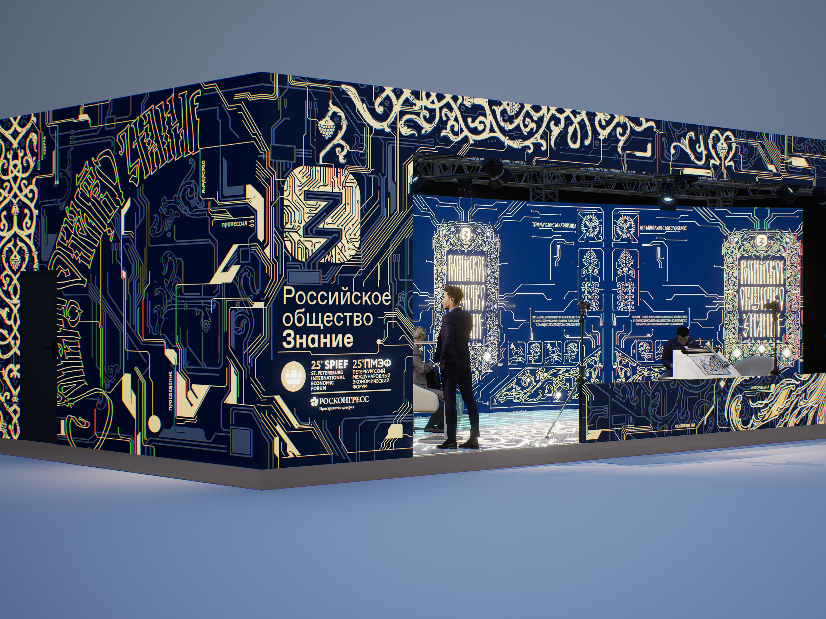Дизайн студии в этом году вдохновлен неразрывной связью между культурным прошлым и будущим нашей страны. В оформлении использован растительный орнамент русского художника, иллюстратора и театрального оформителя Ивана Билибина в сочетании с изображением дорожек цифровой печатной платы. Объединяясь в причудливую корневую систему, они создают прочную связь от древнерусской культуры к современной и далее – к будущему.