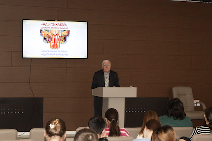 Казбек Ачмиз, заведующий отделом истории АРИГИ им. Т.М. Керашева» выступил в роли лектора акции «Достижения России» и рассказал молодым слушателям о достижениях России.